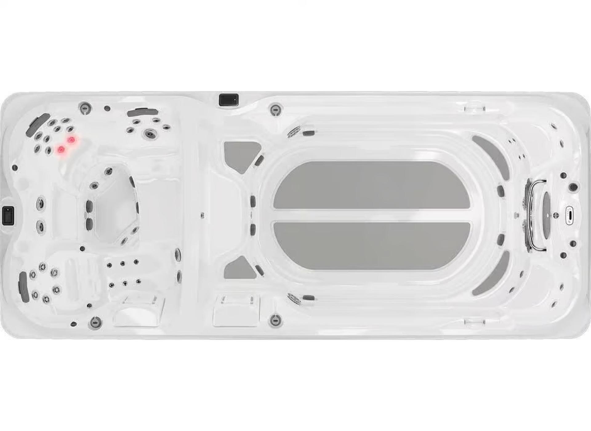 Avec ses 561 x 234 x 134 cm et ses 7 066 litres de volume, il intègre deux zones indépendantes : une pour la nage à contre-courant et une pour la détente hydromassante.